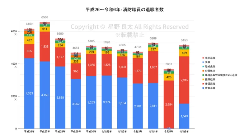 - 消防士の普通退職者は平成26年〜令和6年の11年間で約3.4倍に増加し、年間2,700人以上が自らの意志で退職している